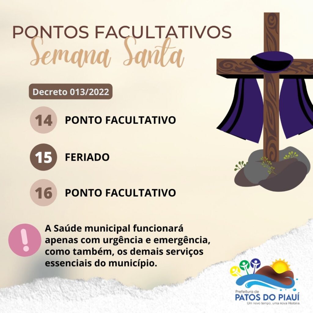 A Prefeitura de Patos do Piauí decretou ponto facultativo na próxima quinta-feira (14) e sábado (16) em todas as repartições que compõem a Administração Pública Municipal.