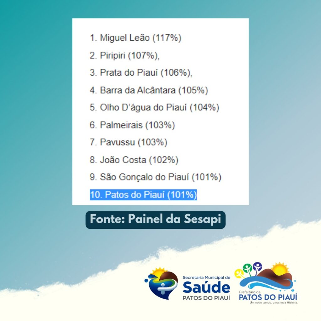 O portal Cidade Verde divulgou no sábado (19.mar) uma matéria com dados do painel da Secretaria de Estado de Saúde do Piauí (Sesapi), em que o município de Patos do Piauí aparece em 10º lugar, entre os 49 municípios, dos 224, com vacinação de mais de 90% do público infantil, com idades entre 5 e 11 anos com a primeira dose contra a Covid-19.